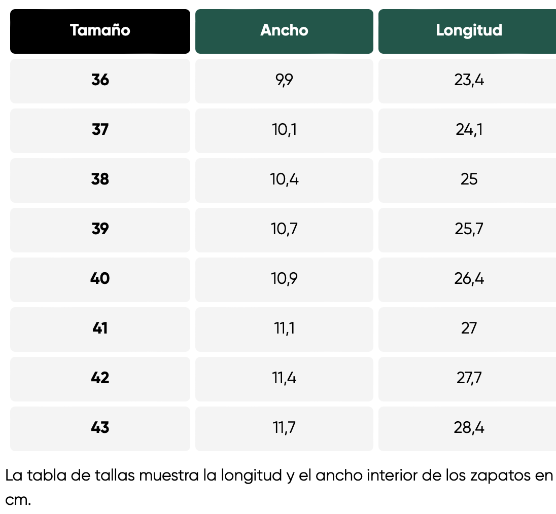 • Horma: Anatómica, con amplio espacio para los dedos.